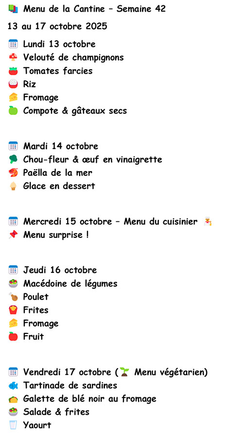 Lundi 16 janvier Salade niçoise Pâtes bolognaise Salade Fromage blanc Mardi 17 janvier Soupe Omelette Purée Fromage Fruit Jeudi 19 janvier Crêpe jambon-emmental Sauté de porc Poêlée celtique Fromage Salade de fruits Vendredi 20 janvier Salade mixte au (...)