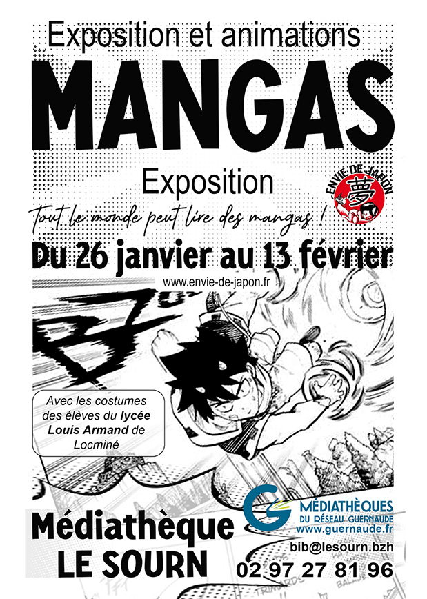 Du 26 janvier au 13 février, venez découvrir notre exposition dédiée aux mangas : "Tout le monde peut lire des mangas !" Une occasion unique d’admirer les costumes créés par les élèves du lycée Louis Armand de Locminé et de vous immerger dans cet art captivant.